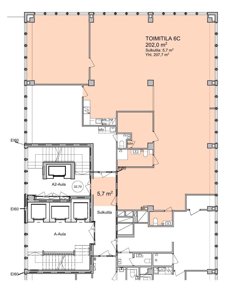 Valoisa toimistotila Autotalon kuudennessa kerroksessa. Tästä pääosin avoimesta tilasta avautuvat näkymät kolmeen eri suuntaan. Tila koostuu avokonttorista, neuvotteluhuoneesta, omasta taukokeittiöstä sekä wc- ja suihkutiloista.
