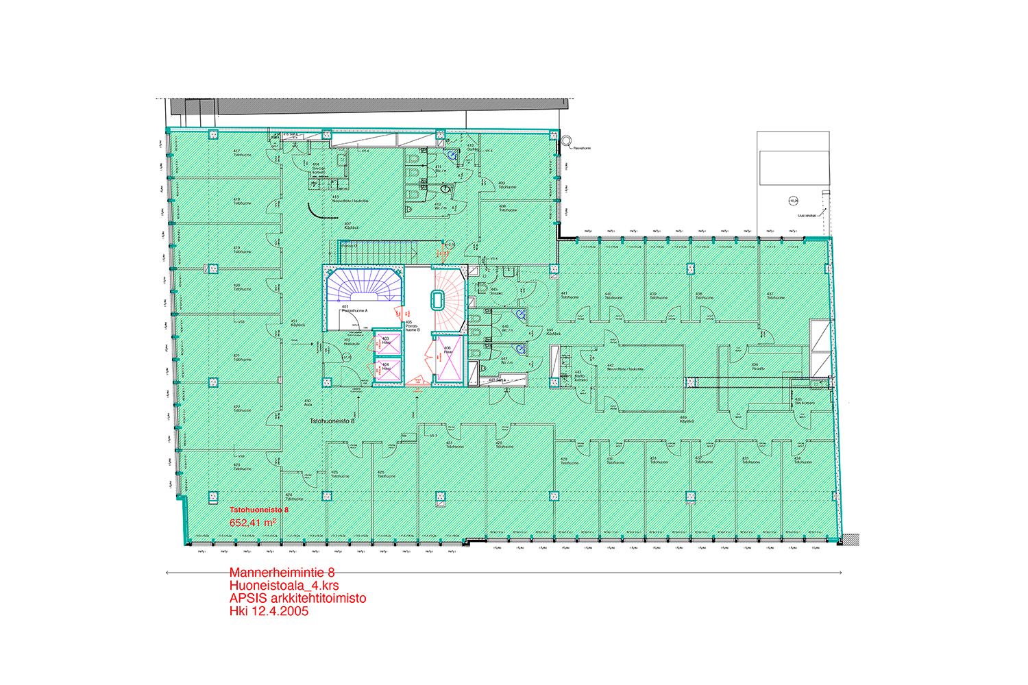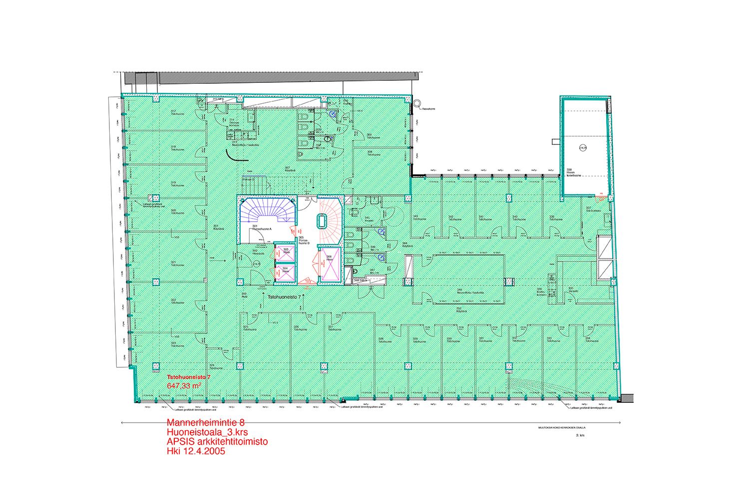 kerros toimistotilaa 232 m² ja 415 m² = 647 m²