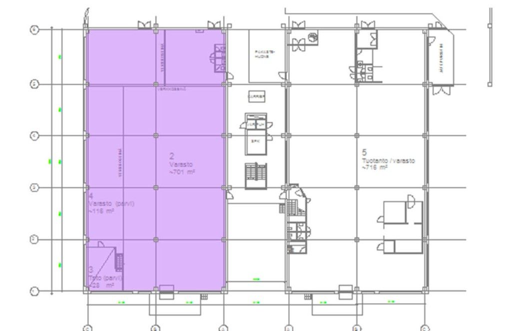 2027 alussa vapautuva kokonaisuus varasto/tuotanto/huoltotilaa sekä toimistoa rakennuksen toisesta kerroksesta. Tilassa lastauslaituri sekä sisäänkäynti parkkihallin puolelta. Parkkihallissa lattiakaivollinen huoltotila. toimisto (97m2) rakennuksen toisessa kerroksessa voidaan vuokrata osana tätä kokonaisuutta tai tarvittaessa jättää pois. Varaston korkeus n.5m.