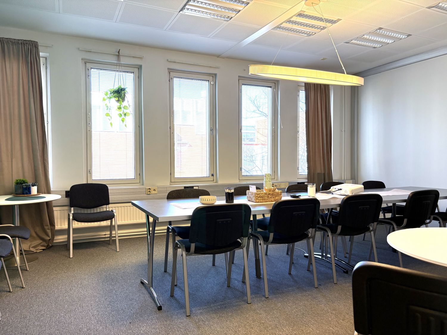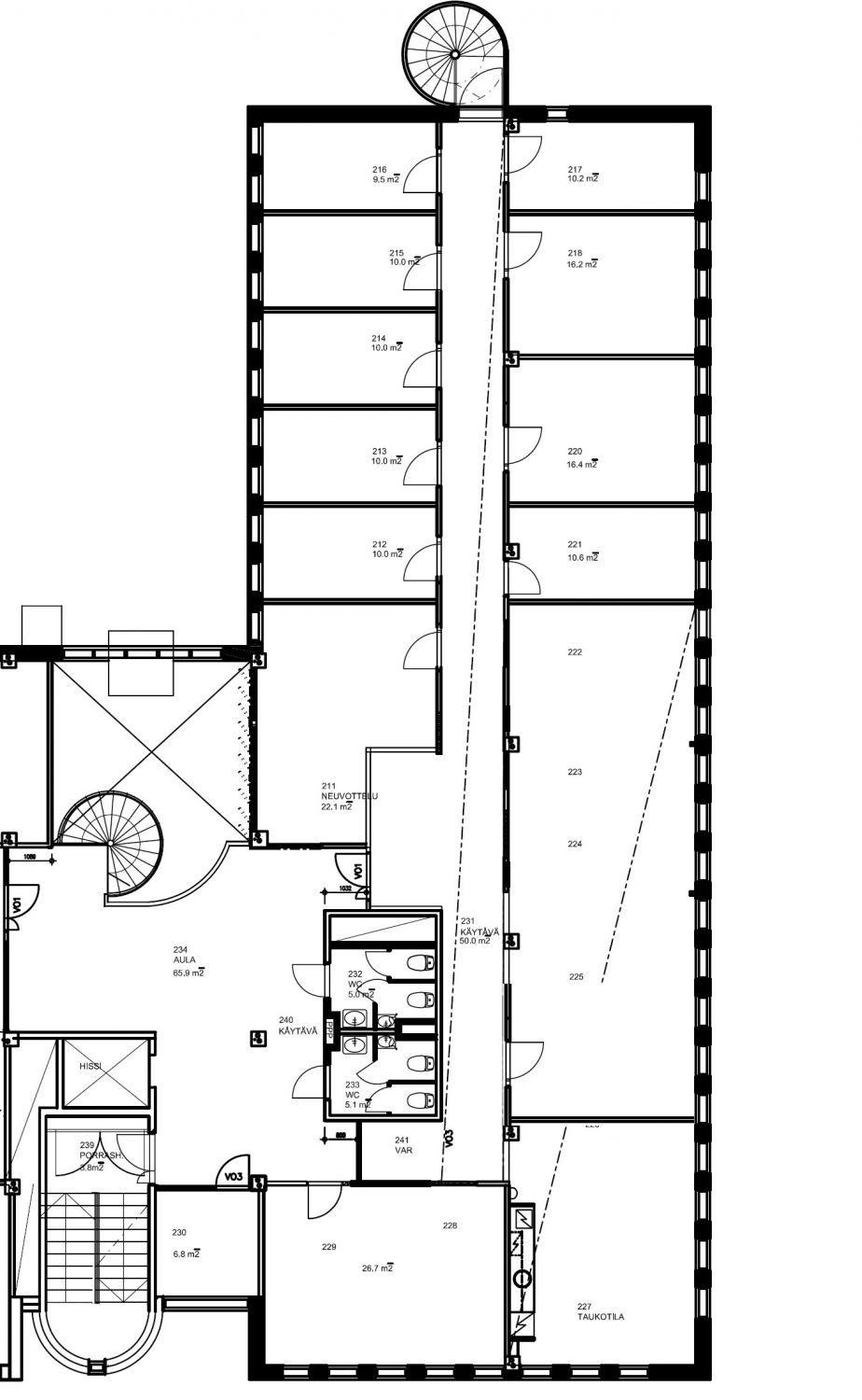 Talon toiseen kerrokseen sijoittuvassa tilassa on viihtyisät aulatilat. Halutessasi käytössäsi on kokoustiloja n. 30 henkilölle. Kokoustilan yhteydessä on keittiö, jota esimerkiksi catering -palvelu voi hyödyntää. Tilan neliömäärä on 333m2, johon sisältyy jyvitykset yhtiön käytävistä, aulan vessoista sekä kellarin sosiaalitiloista.