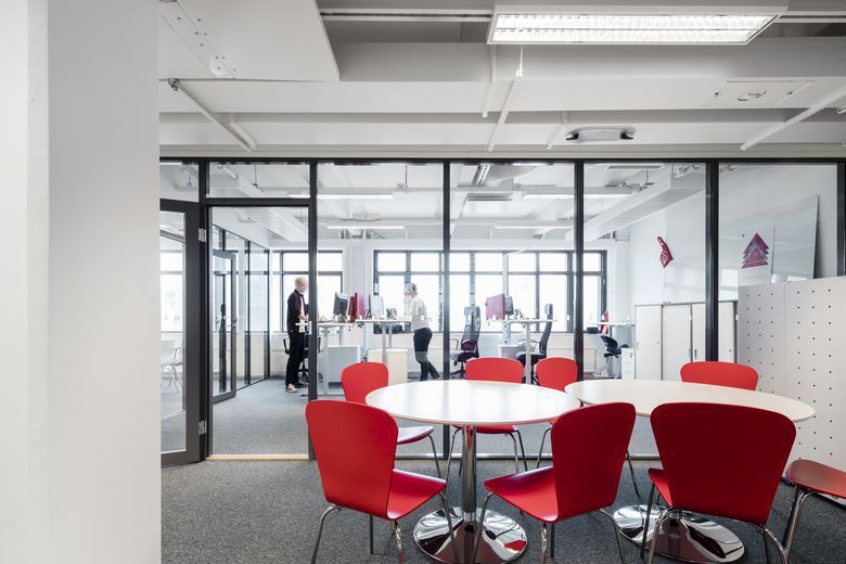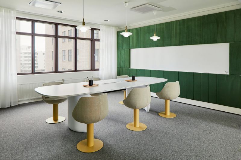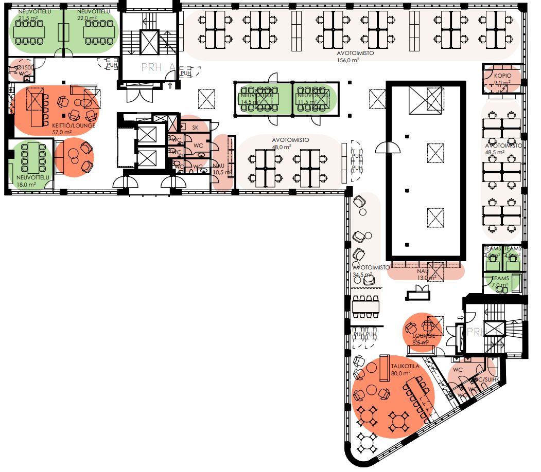 Tilatehokkuus on erinomainen 19,5 m²/henkilö, ja yhteensä kiinteillä ja vapaamuotoisilla työpisteillä pystyy työskentelemään 56 henkilöä. Kulku onnistuu sekä A- että B-rapusta, mikä tekee liikkumisesta sujuvaa myös suuremmalle organisaatiolle.