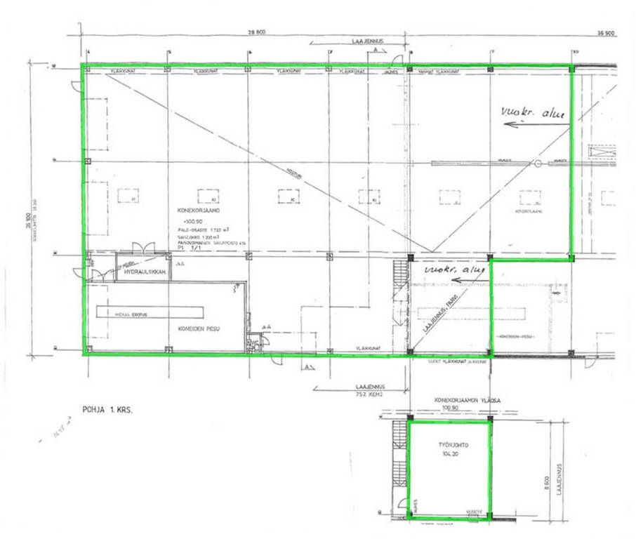 Tämä 1110 m² toimitila on sisään ajettava, siinä on kolme nosto-ovea. Lisäksi tilasta löytyy siltanostin. Kokonaisuuteen kuuluu lämmintä varasto- ja hallitilaa 1 000 m², kylmää hallitilaa 50 m² sekä parvella toimistotilaa 60 m². Soveltuu hyvin mm. raskaampaan korjaamotoimintaan. Vapautuminen 1.2.2027.