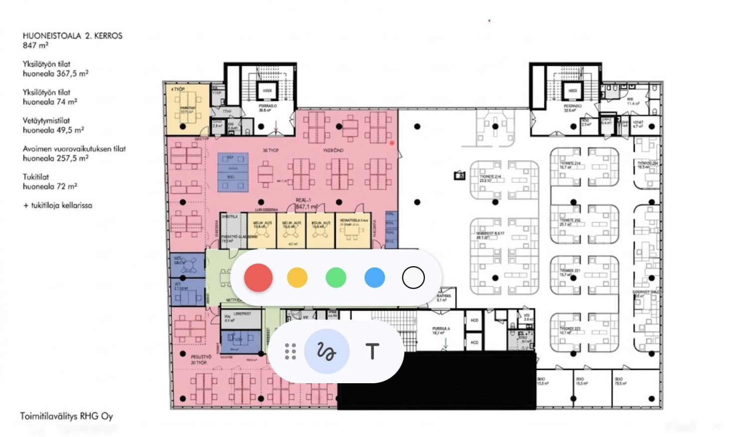 Remontoidut modernit jäähdytetyt tilat, joista löytyy sekä avotilaa, ryhmätyö- että neuvottelutilojen lisäksi tyylikäs keittiökokonaisuus. Tilassa on myös pienempiä hiljaisia huoneita. Toimistotilassa on kuituyhteys.