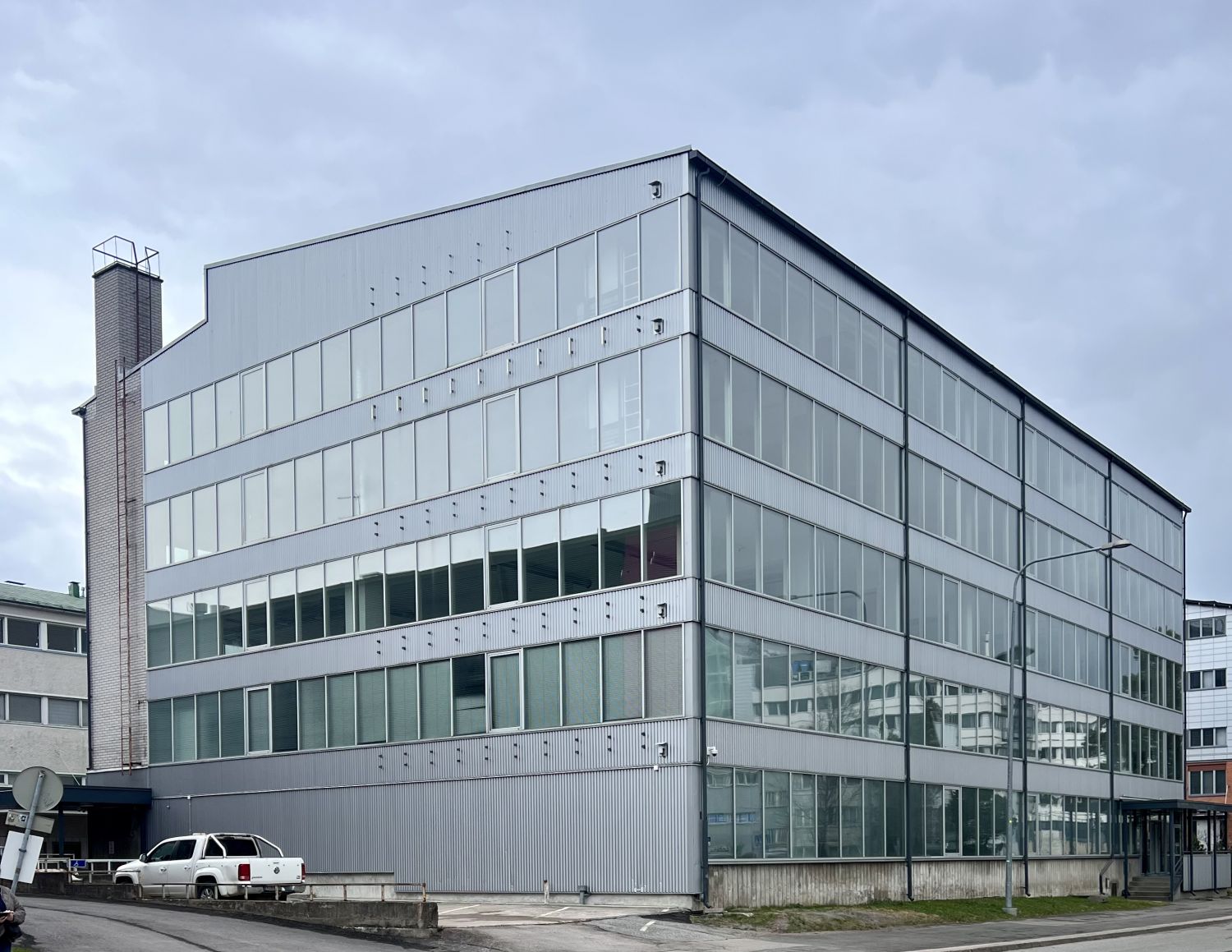 Pysäköintihalli sekä pysäköintipaikkoja pihalla.