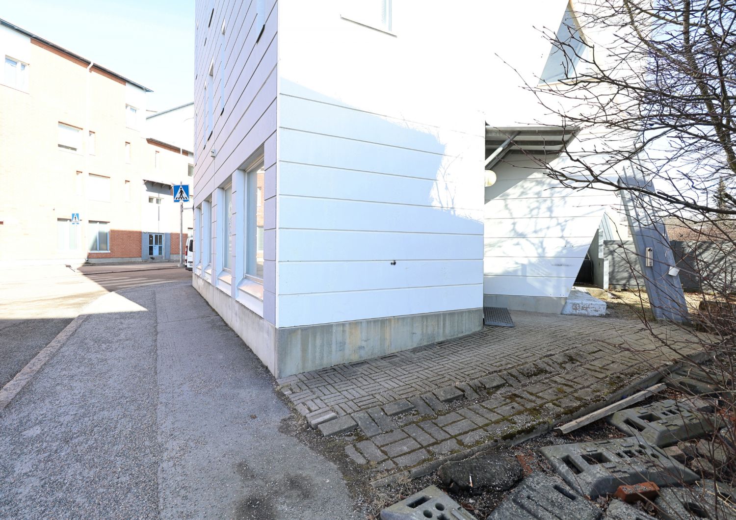 Liiketilassa on oma sisäänkäynti talon päädystä, mikä tekee kulkemisesta sujuvaa ja tarjoaa hyvän yksityisyyden.