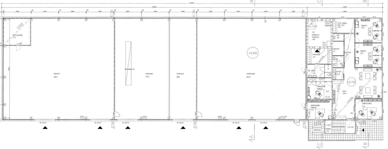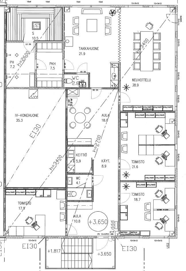 Toimistot kahdessa kerroksessa 246m2 + 241m2 = 487m2