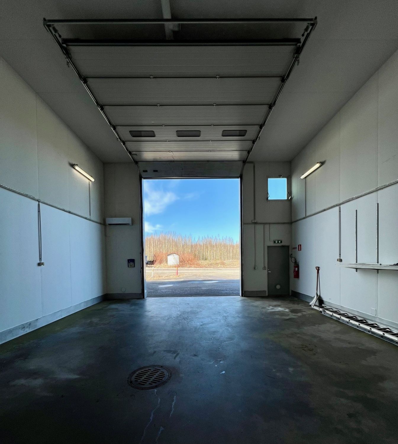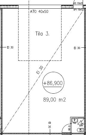 Tilan mitat: syvyys (pituus) nosto-ovesta vastakkaiseen seinään n. 11,6 m x leveys n. 7,7 m x sisäkorkeus n. 5,5 m.