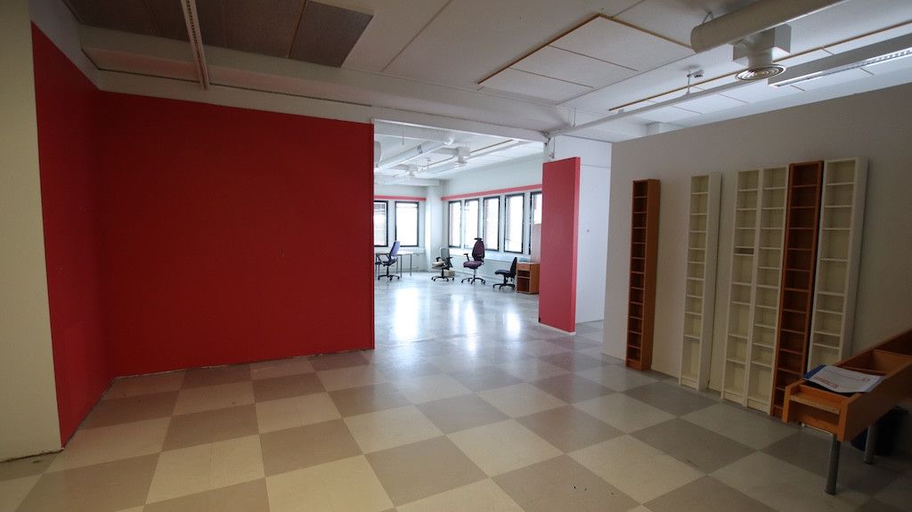 Toisen kerroksen avotoimistotila. Sisäänkäynti Helsingintein puolelta. Tila soveltuu mainiosti avotoimistokäyttöön tai tiimeille jaettavaksi.