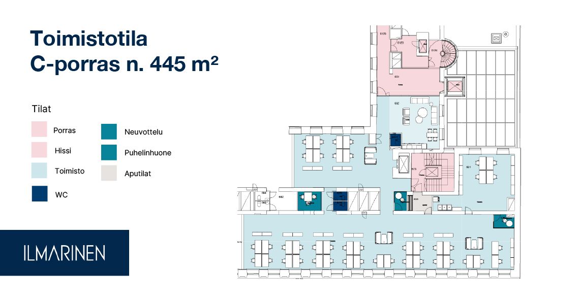 Kiinteistössä on yhteensä 5750 m² vuokrattavaa toimistotilaa, joka jakautuu kuuteen kerrokseen. Tilat ovat moderneja monimuotoisia työtiloja, joista löytyy niin huoneita kuin avotilaakin. Kaikissa kerroksissa on omat keittiö- ja wc-til...