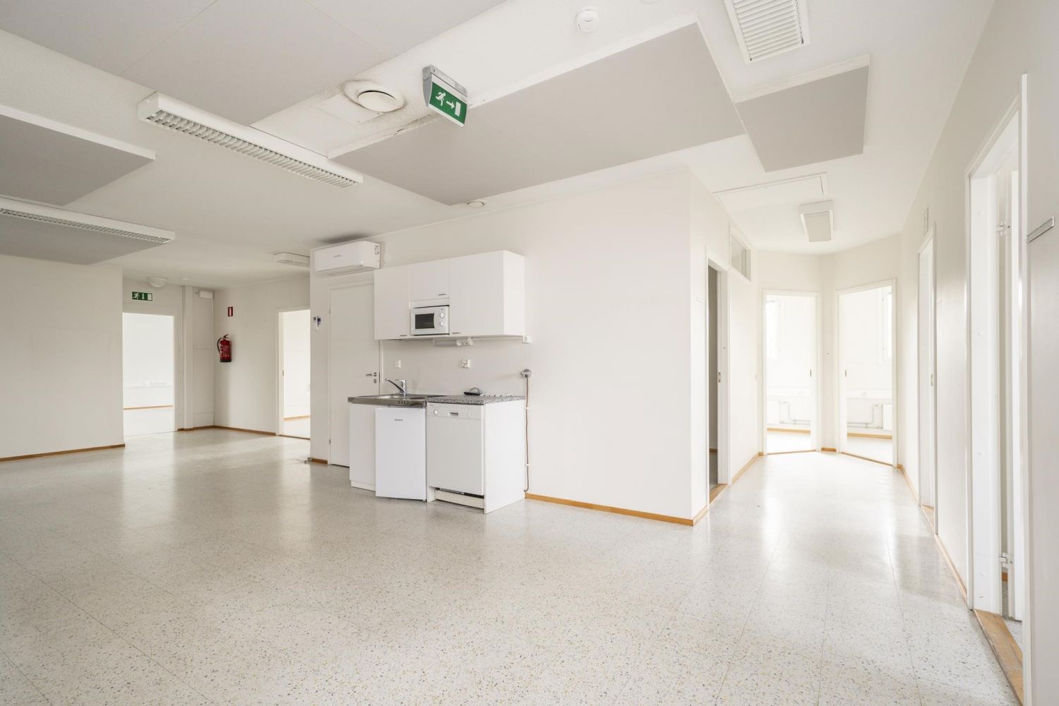 2. kerroksen valoisa toimistotila, jossa 4 toimistohuonetta, neukkari sekä avotilaa. Toimistotiloissa lattiat tekstiilipalamattoa ja aulatiloissa parkettia.